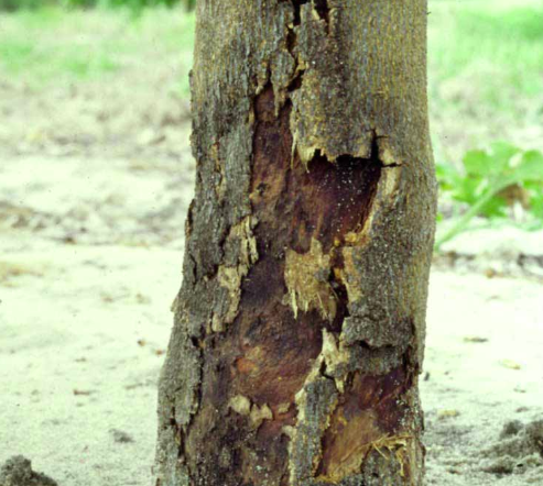 Grietas o exudados oscuros en la base del tronco.