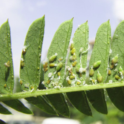 La psila es un pequeño insecto similar a un pulgón con alas. Se sitúa principalmente en el envés de las hojas, donde se alimenta de savia y deja abundante melaza que favorece la negrilla. Su ciclo se repite varias veces al año en climas cálidos.